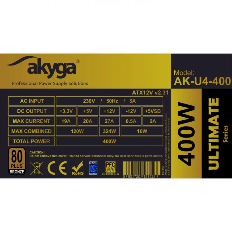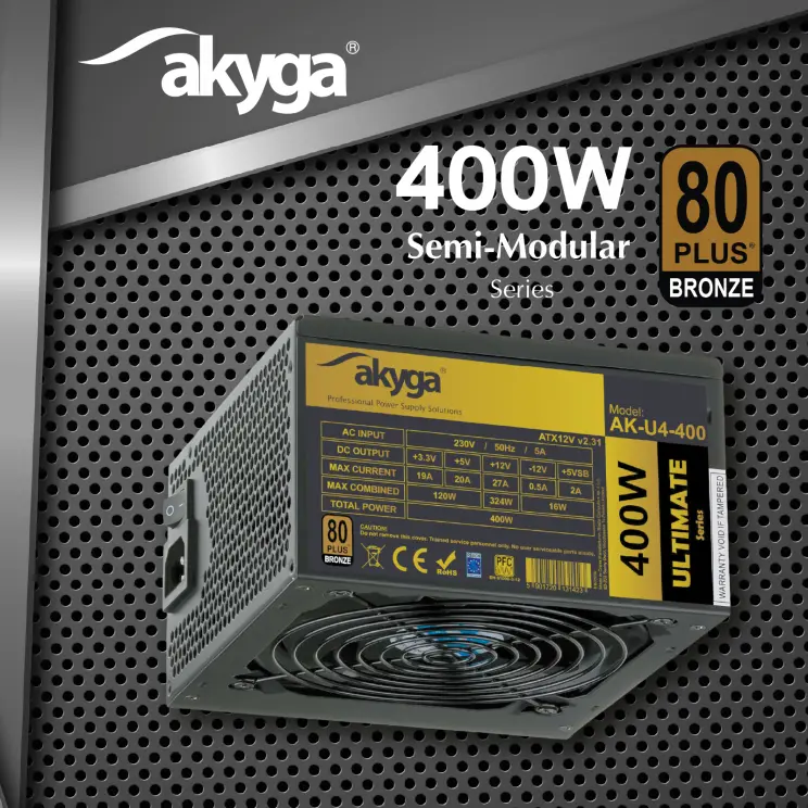 Az AK-U4-400 tápegység 400 W folyamatos teljesítményt nyújt. A terméket a hatékony hűtés jellemzi a maximális terhelésű működés során, amelyet egy beépített 120 mm-es ventilátor biztosít. A ventilátor hatékonyságát egy fordulatszám-ellenőrző vezérlő biztosítja, amely az alkatrészek hőmérsékletétől függően állítja be a ventilátor fordulatszámát. Ezenkívül a kábelek széles választéka akár 9 eszköz csatlakoztatását teszi lehetővé, amelyek SATA / MOLEX / MINI-MOLEX aljzatokkal vannak felszerelve és egy erős grafikus kártyáét, amely két PCI-Express aljzattal rendelkezik. Ezen felül a kiterjesztett garancia biztosítja az áramellátás megbízhatóságát.