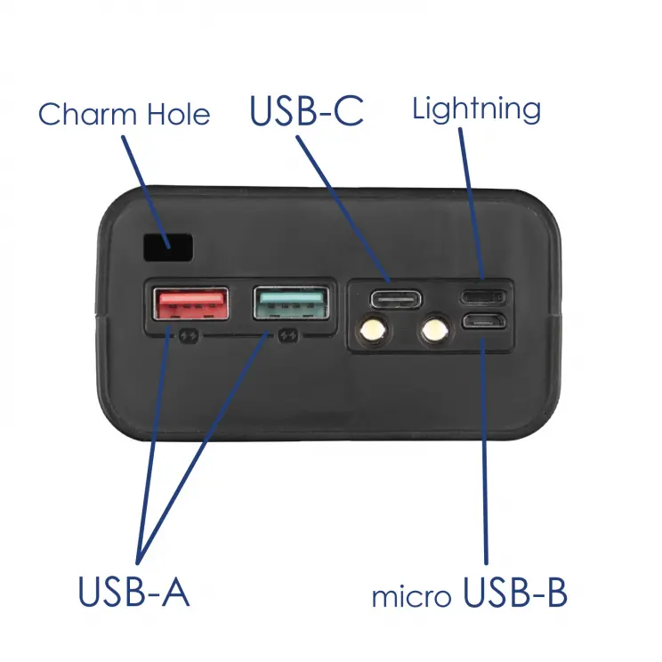 A tok belsejében található akkumulátorok töltése is a kényelmet szem előtt tartva lett kialakítva. Három népszerű bemeneti csatlakozó áll rendelkezésre: micro USB B, Lightning és USB-C, amelyek lehetővé teszik szinte bármilyen elérhető kábel vagy töltő használatát – anélkül, hogy egy speciális megoldást kellene keresni.