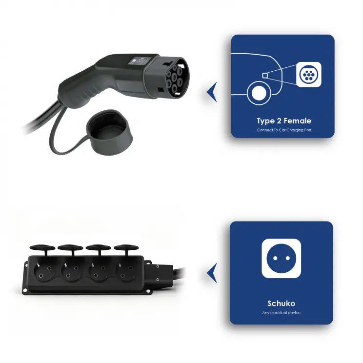 Az adapter 2-es típusú hím csatlakozóval (IEC 62196) van felszerelve, amelyet elektromos autó töltőállomáshoz csatlakoztathat, valamint egy női Schuko csatlakozóval, amelyhez standard hálózati tápegységet csatlakoztathat – például elektromos kerékpár, robogó, egyenirányító vagy más, legfeljebb 3,5 kW teljesítményű berendezés. Ez azt jelenti, hogy bármely CEE 7/4 csatlakozóval rendelkező töltő használható ott, ahol általában csak elektromos járművekhez való csatlakozók állnak rendelkezésre.